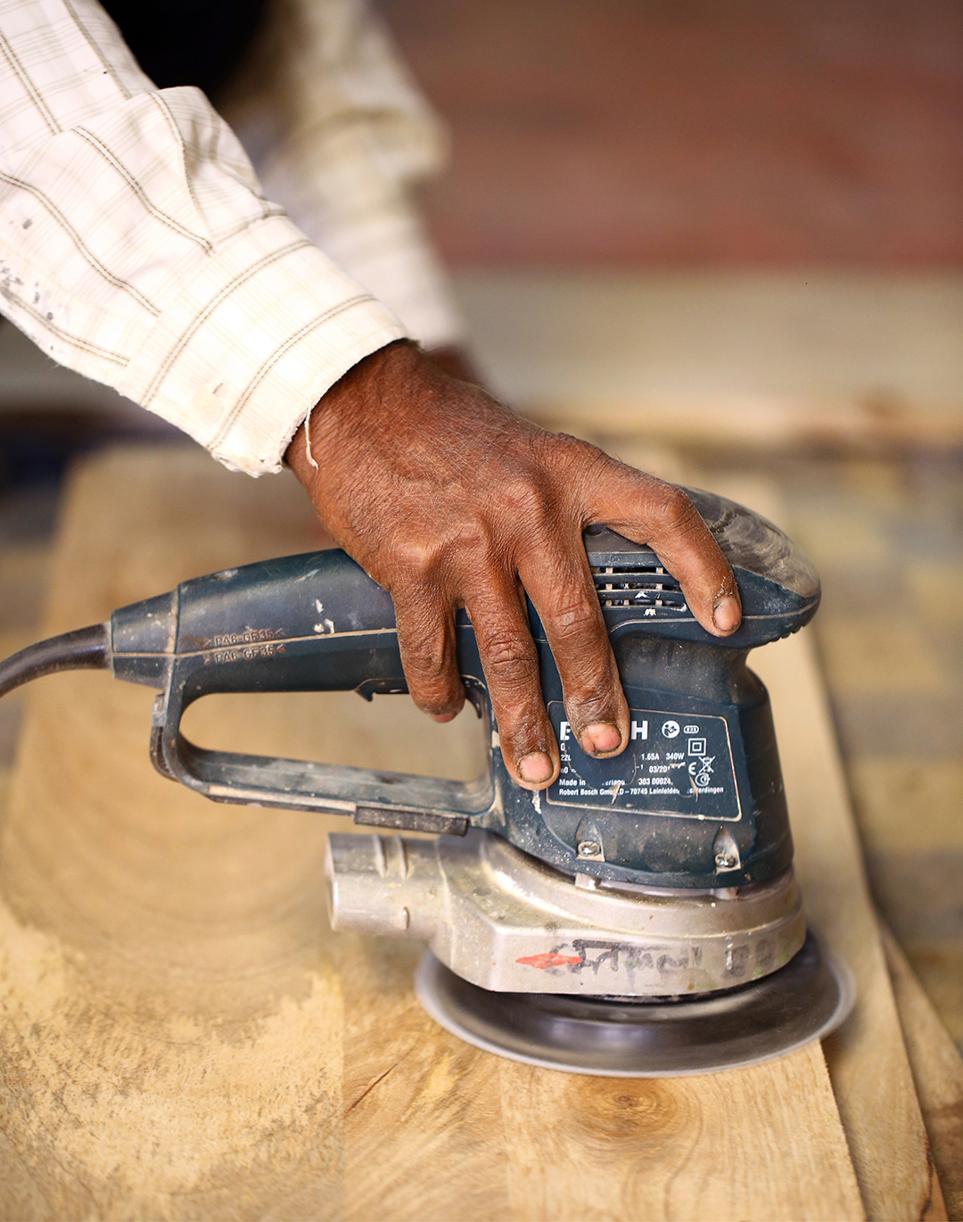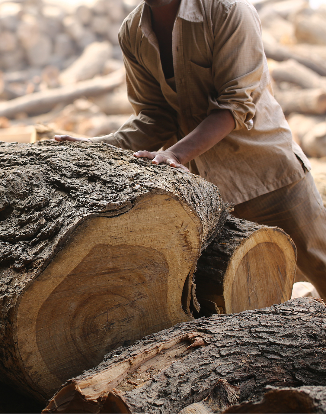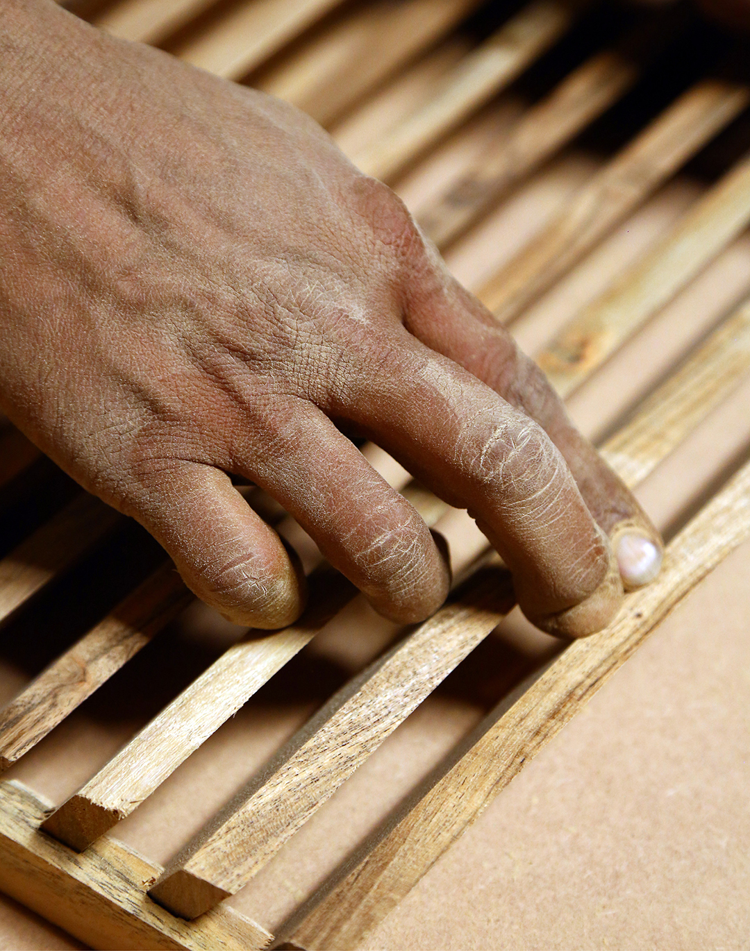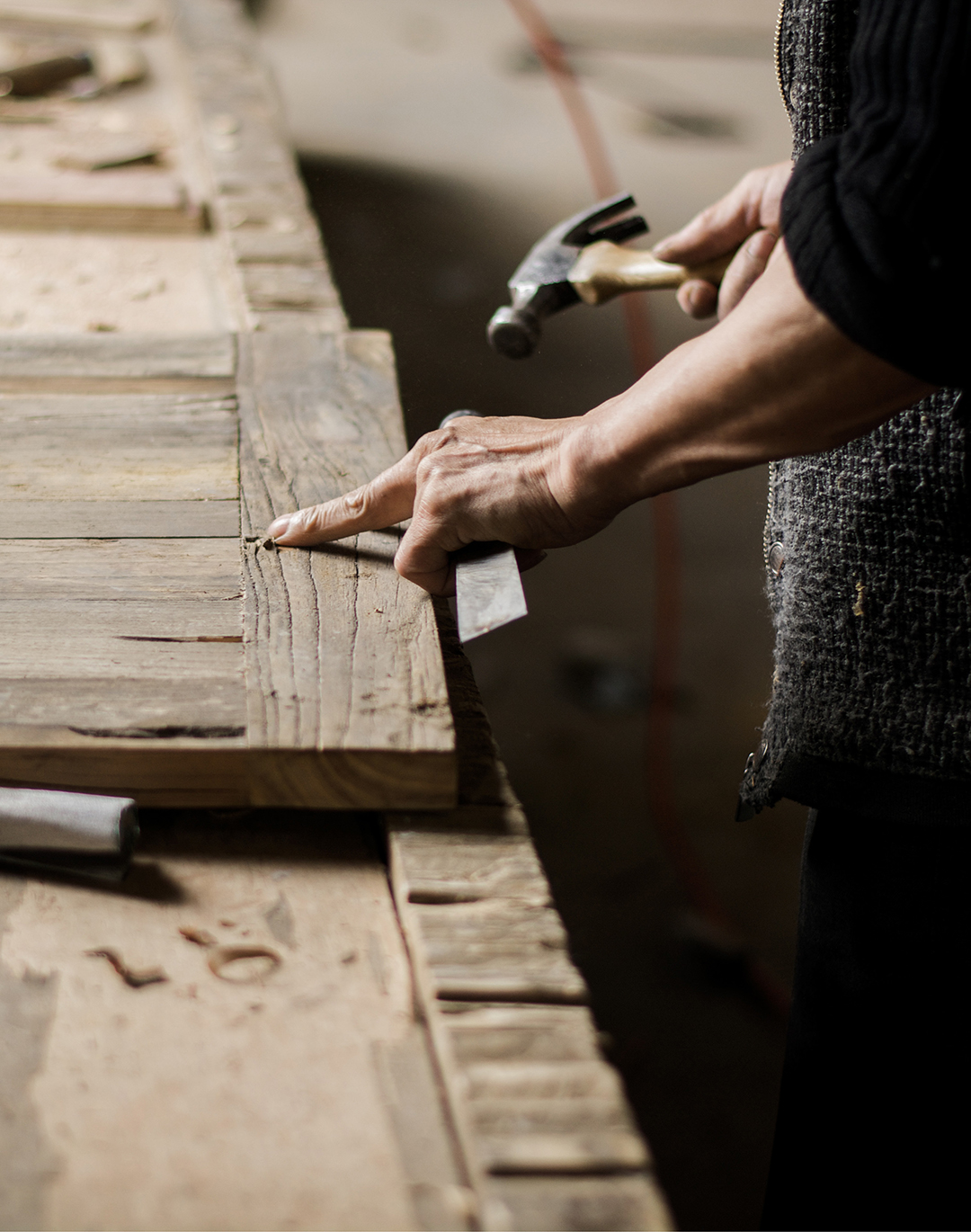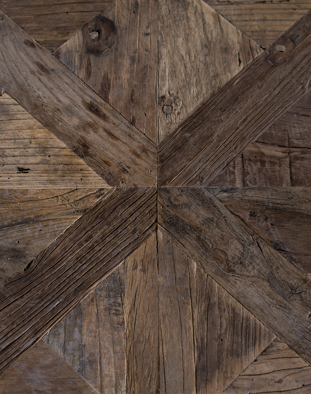 Holz spielt eine wichtige Rolle bei der Möbelherstellung. Rivièra Maison verwendet hauptsächlich recyceltes Holz von alten Türen und Balken. Das Material hat einen ganz eigenen Charakter. Die Werkstatt nennt es „untouched“; unbehandelt und nahezu im Originalzustand. Wo früher Scharniere waren, sind jetzt Löcher. Risse in antiken Türen werden zu Rissen in Tischplatten, und eine Tür, die immer dem Regen ausgesetzt war, hat eine andere Farbe als eine, die meist trocken oder in der Sonne stand. Alt, durchlebt und naturbelassen, damit arbeiten wir am liebsten.