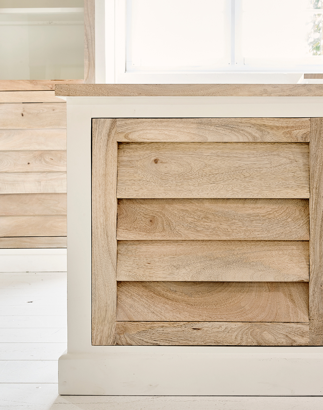 Alle RM-Akazienmöbel werden handgefertigt. Jedes Teil wird von Hand vermessen und mit matter weißer Kreidefarbe lackiert, die von Hand angemischt wird. Farbunterschiede zwischen den Möbelstücken sind möglich.